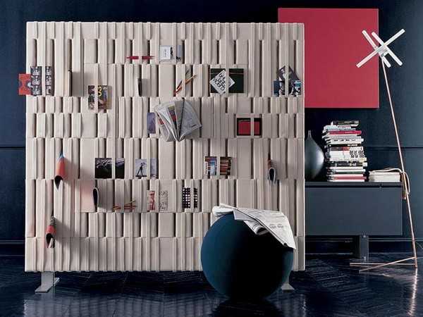 Оригинальную двухстворчатую ширму придумал гуру итальянского дизайна Гаэтано Пеше (Gaetano Pesce): благодаря переворачивающимся полкам она легко превращается в стеллаж.