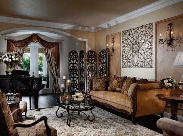 Обильный декор требует пространства, предполагает наличие аксессуаров ручной работы и использование дорогих материалов: натурального камня, дерева благородных пород, керамики, стекла.