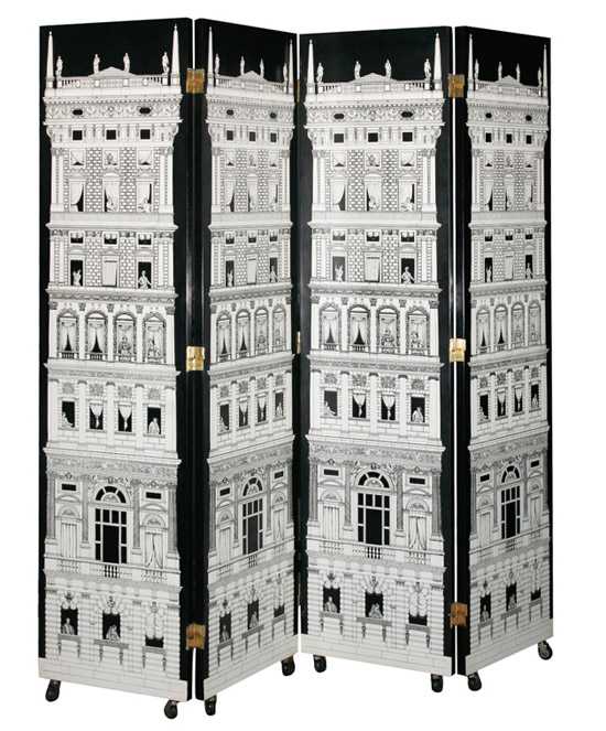 Любил ширмы и Пьеро Форназетти (Piero Fornasetti) – мастер иллюзий, обманок и оптических эффектов. На створках ширм Fornasetti выписаны библиотеки, предметы интерьера, архитектурные элементы и целые города. И, конечно же, авторские лейтмотивы — солнце, луна, лицо певицы Лины Кавальери.