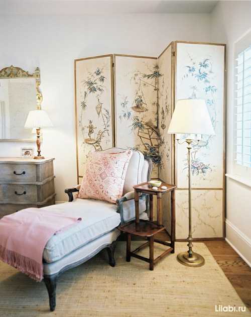 Ширма в комнате может служить перегородкой, будь то уголок для переодевания в спальне или кресло с торшером в гостиной. Создается пространство, недоступное посторонним взглядам.