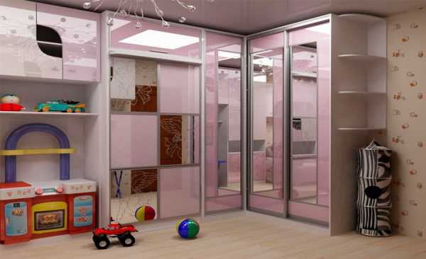 - угловой встроенный шкаф купе занимает мало места за счет раздвижной конструкции двери. Положительным фактором этого вида является отсутствие травм при открытой дверце. Таким комнатам как детский, такой вариант подойдет больше всего.