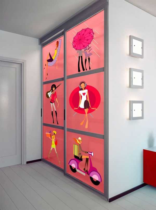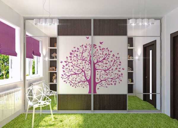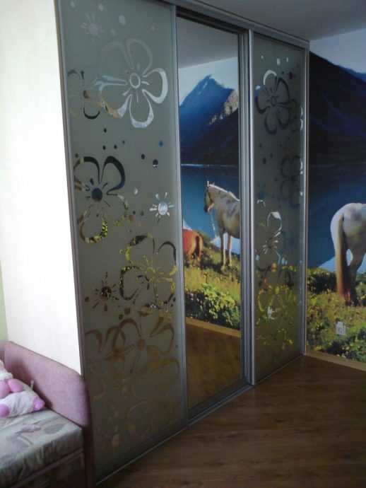 Чтобы при этом шкаф выглядел нарядным и неповторимым, его декор можно дополнить рисунком из матового напыления. Девушкам-подросткам же обязательно понравятся фасады с фотопечатью или всевозможными видами витража.
