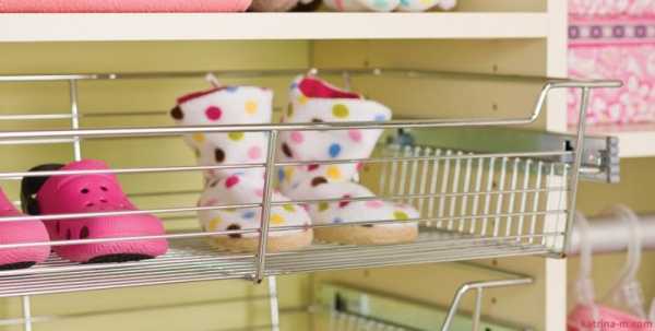 - Нижняя часть. Полочки для обуви, а также вещей, которыми ребенок пользуется не часто.