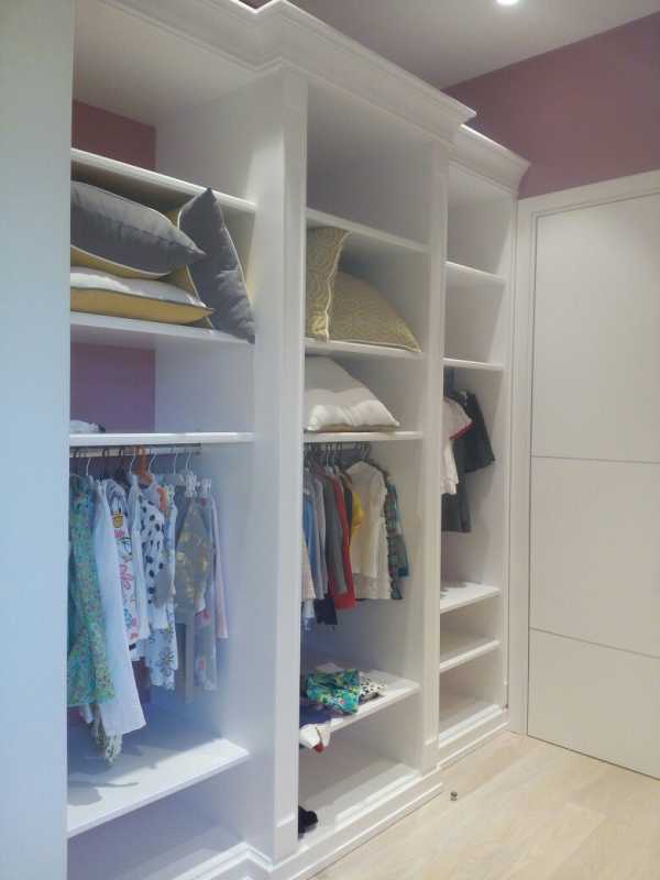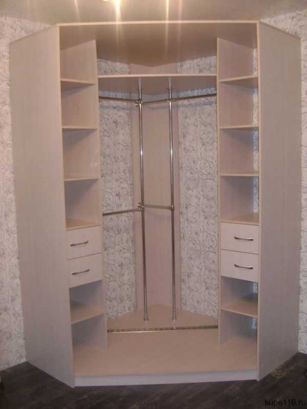 Для того чтобы полностью использовать его вместительность, дизайнеры рекомендуют в угловом пространстве установить несколько штанг для вешалок. А сами полки расположить по бокам конструкции.