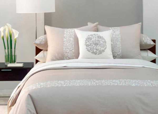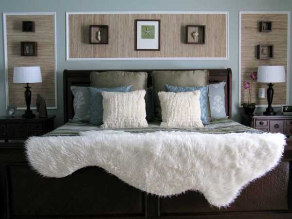 Для покрывала на кровати следует подобрать подходящий текстиль, пледы и декоративные подушки. Не допустите излишнюю пестроту – в дизайне квартиры хватит двух-трех гармонирующих оттенков, например, теплый бежевый, золотистый и шоколадный. В этой же гамме должно быть выдержано и постельное белье.