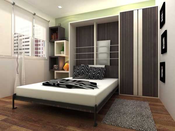 В очень маленькой комнате можно поставить кровать-шкаф. В дневное время кровать понимается, и выглядит как шкаф, а ночью это комфортное и полноценное спальное место. Этот вариант прекрасно подойдет тем, кто совмещает в одной комнате несколько. Например, спальню и гостиную или спальню и кабинет.