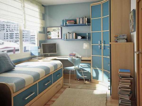 Оформление маленькой спальни, предназначенной для ребенка, предусматривает использование совмещенных конструкций. Обратите внимание на мебель встраиваемого типа, а также наличие стеллажа.
