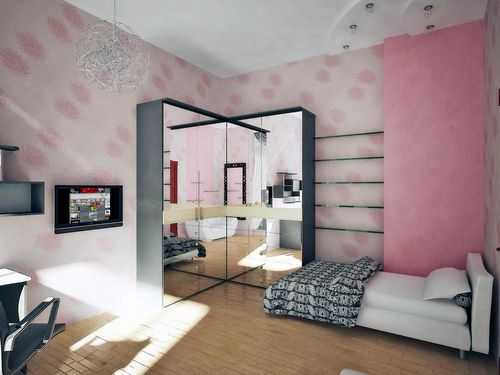 Для небольшой комнаты идеальным решением станет угловой шкаф с зеркальными дверями. С его помощью удается добиться визуального увеличения помещения.