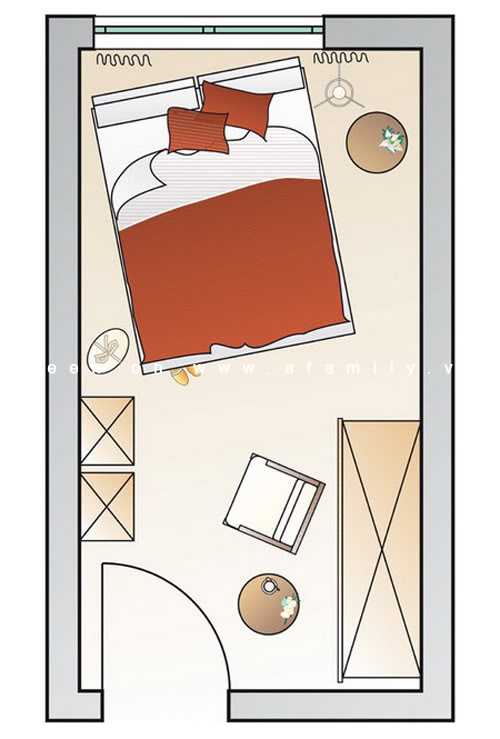 - Для начала следует определиться с композиционным центром. Для маленькой спальни это, конечно, будет кровать. Размещая мебель в спальне, следует оставить пространство посредине комнаты, дабы она не казалась перегруженной. Желательно поместить мебель по периметру спальных комнат, не оставляя между стенами никаких зазоров. Если узкой спальне требуются прикроватные тумбочки, то их не следует подбирать выше самой кровати.