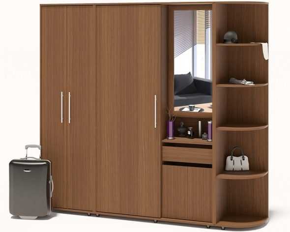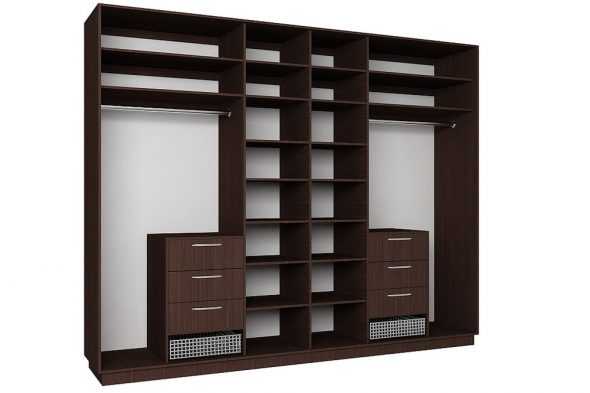 В стандартном изделии обязательно должны присутствовать несколько полок, выдвижные ящики, вешала для одежды.