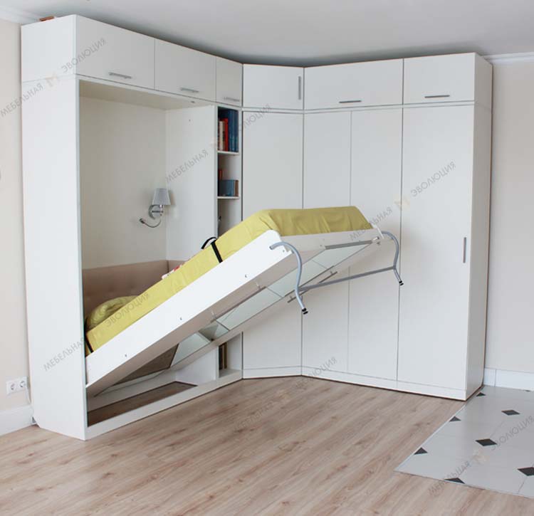 Представляет собой в сложенном виде обычный шкаф с отделениями. Однако стоит только потянуть за ручку, как из нижнего шкафчика выдвигается спальное ложе. Механизм представляет собой гармошку, которой удается занять минимальное пространство в сложенном состоянии.