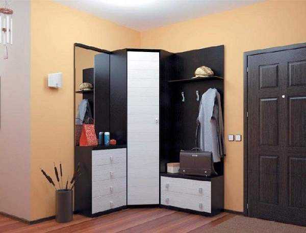 - в углу помещения — этот выбор считается наиболее оптимальным для любой маленькой прихожей. Фото такого размещения шкафа представлены ниже. Для такого расположения необходимо приобретать специальный угловой шкаф. Он должен хорошо вписываться в интерьер и имеющийся участок комнаты. Он не будет мешаться даже в самой маленькой прихожей;