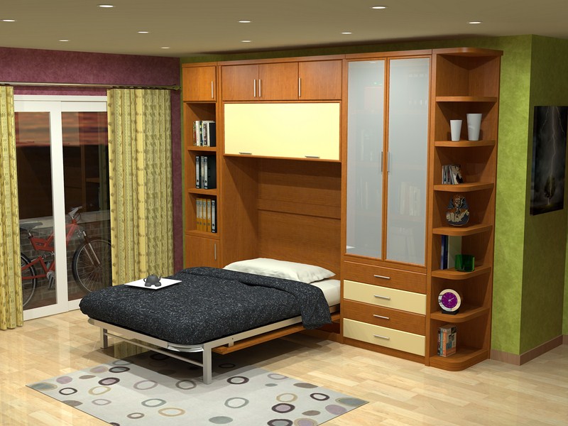 Возможно, такая складная стенка и не настолько глубокая, как стандартный шкаф, но зато ее совершенно не будет видно днем. Внешний вид такой мебели – официально- деловой. Поэтому установить раздвижную кровать вы сможете как в столовой, так и в гостиной комнате. Как только вы будете оставаться наедине, опустите кровать и помещение превратиться в полноценную спальню.