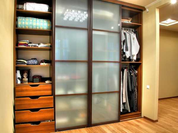 Шкаф-купе с полками и ящиками с матовым стеклом.Отделения для верхней одежды