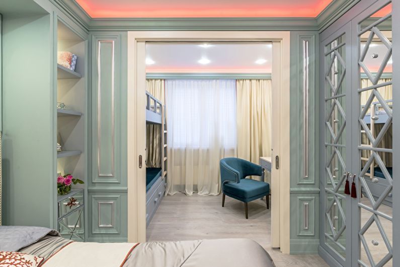 Комнату для двух детей с минимальной разницей в возрасте до 10 лет не обязательно разграничивать на личные зоны. Оформление делается нейтральным, без половых отличий. Рекомендуется использовать лимонные, светло-зеленые, персиковые или бирюзовые оттенки. Только участок над кроватью выделите гендерным цветом или любимыми игрушками. Рекомендуется использовать многофункциональную мебель с ящичками и дополнительными отсеками под хранение.