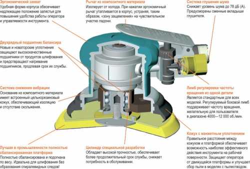 Пневматическая орбитальная шлифмашина имеет достаточно простое устройство.