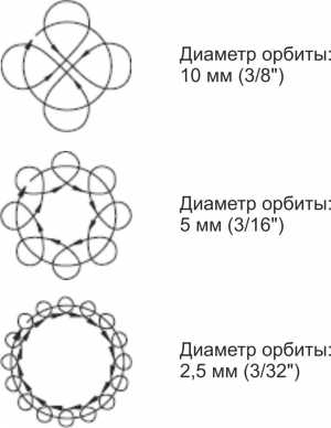 По сути, амплитуда колебания и скорость вращения связаны между собой. Именно сочетание этих двух движений и позволяет выполнять высококачественную шлифовку. На рынке представлены модели с амплитудой от 2 мм до 5 мм. Наименьшей амплитудой обладают шлифмашинки ДВТ. В представленном фото демонстрируются движения шлифовальной тарелки эксцентриковой шлифмашинки, видно как в зависимости от амплитуды колебания меняется качество обработки поверхности.