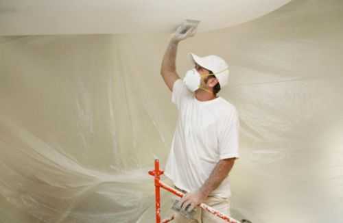 Проводить шпаклевку потолка необходимо в специальной маске и очках, которые защитят вас от попадания пыли в глаза и в рот