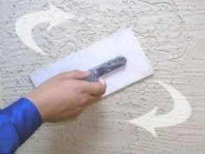Предварительно начинать создавать фактурный слой следует еще до того, пока слой шпаклевки еще не затвердел. Для этого пластиковой теркой, имеющие закругленные концы, совершайте по поверхности круговые движения. Не волнуйтесь, если свежий раствор будет изредка налипать на инструмент, это нормальный процесс.