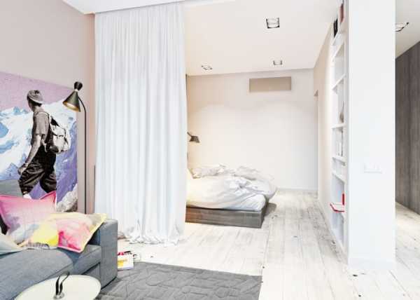 Занавески как легкие ширмы используются для зонирования в квартирах-студиях и в комнатах, в которых спальня объединена с другой функциональной зоной: гостиной, кабинетом, детской.