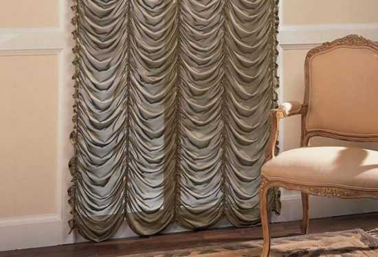 - Итальянские. Они никогда не раздвигаются полностью, элегантно стягиваются шнурами, идущими диагонально к концу карниза и пропускаемыми через кольца с изнанки. Прекрасно декорируют очень высокие окна.