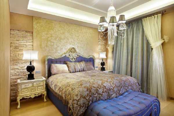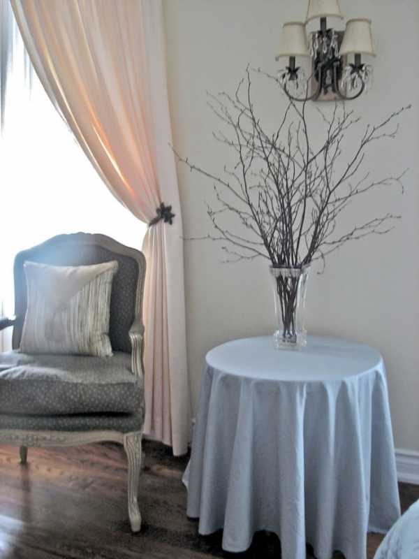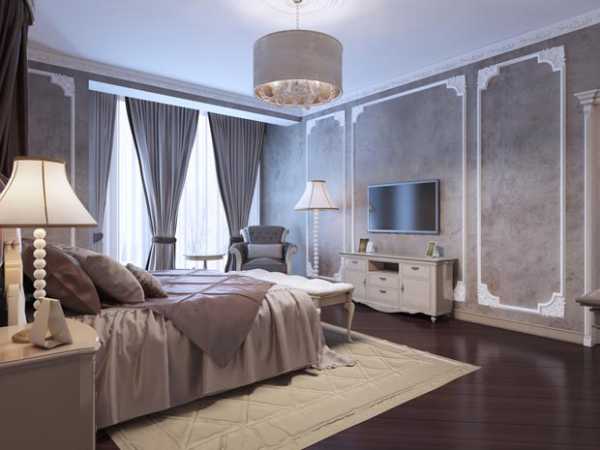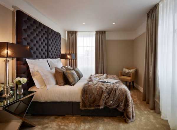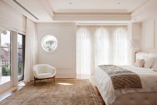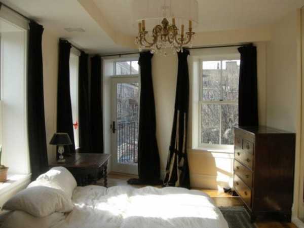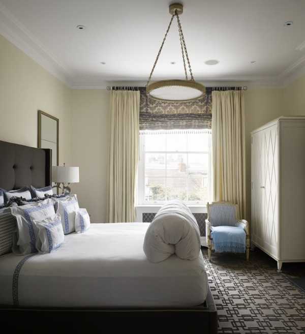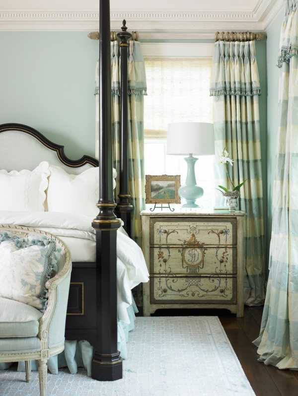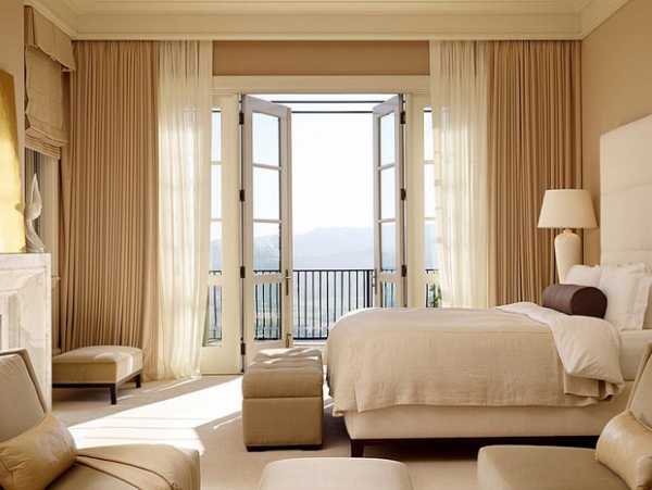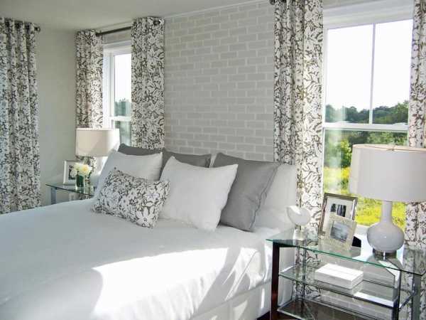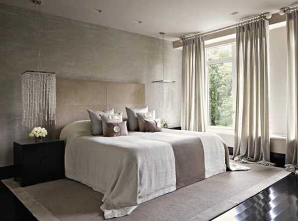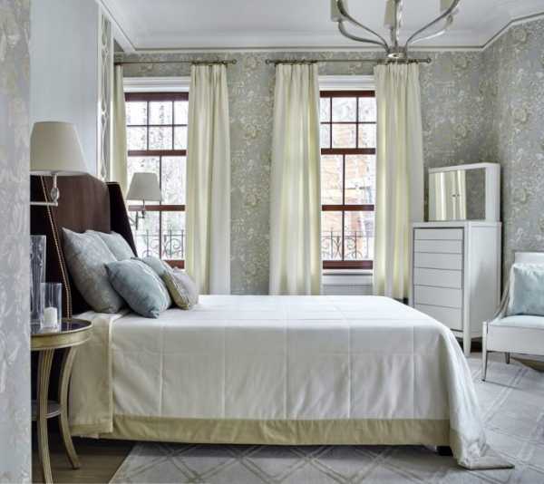 Длинные шторы, складками ниспадающие на пол, придают спальне элегантности. Чтобы добиться такого эффекта обычно занавески делают на 5-15 см длиннее, чем высота до уровня пола.