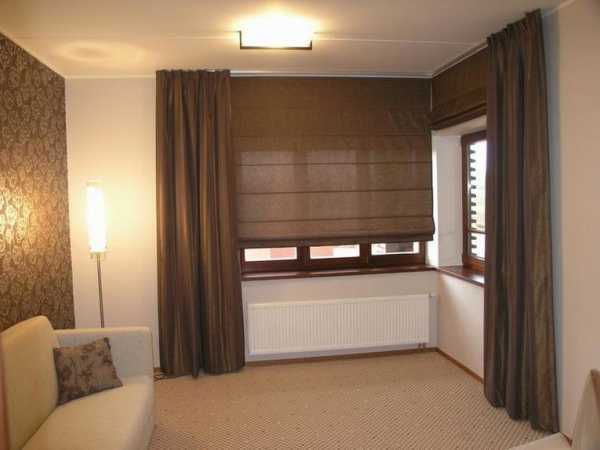На фото кофейные римские занавески с узором в сочетании с роскошным кремовыми портьерами подчеркивают ощущение пространства в этой небольшой, но спокойной комнате.