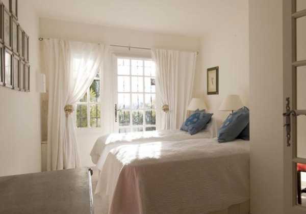 Эту спальню в светлых тонах не следует скрывать от солнца. Вуалевые воздушные шторы с контрастными подхватами являются привлекательным оформлением окна.