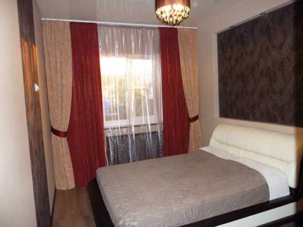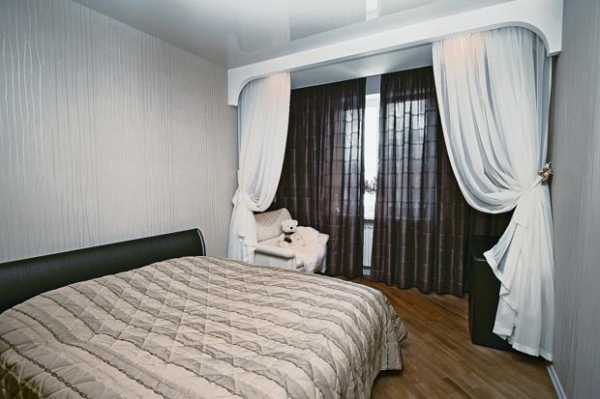 - двойные — используя двойные занавески, можно значительно расширить возможность изменения дизайна спальни в зависимости от вашего настроения. Комбинировать можно две однотонные ткани, или же однотонную ткань с цветной. Этот вариант подходит как для оформления классического дизайна, так и для современных стилей;