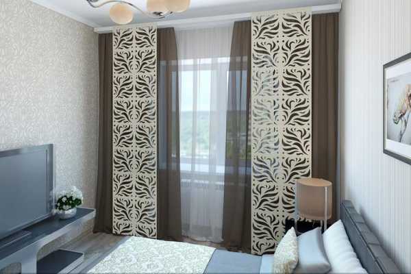 - Лучше всего экранные панели смотрятся в просторных помещениях с большими окнами. Но если для их пошива использовать легкие ткани светлых оттенков, то и для небольшой комнаты они станут удачным дизайнерским решением.