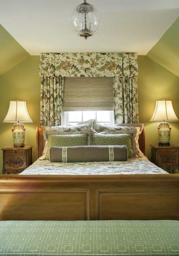 Большинство спален небольшие, и в них, естественно, преобладает кровать, оставляя лишь небольшое свободное пространство. Именно поэтому будьте осторожны, выбирая для штор и занавесок в спальню ткань с узором. Если ткань для штор и постельное белье ярких цветов, да еще с крупным узором, то скромная по размерам спальня сразу же превратится в море ткани.