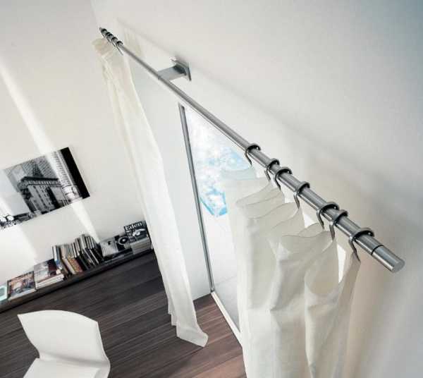 Название изделия во многом говорит само за себя. Его можно установить в разном положении. Часто такой карниз используют не только для оформления окна, но и для его своеобразного зонирования. Состав может включать в себя металл и простой струнный держатель.