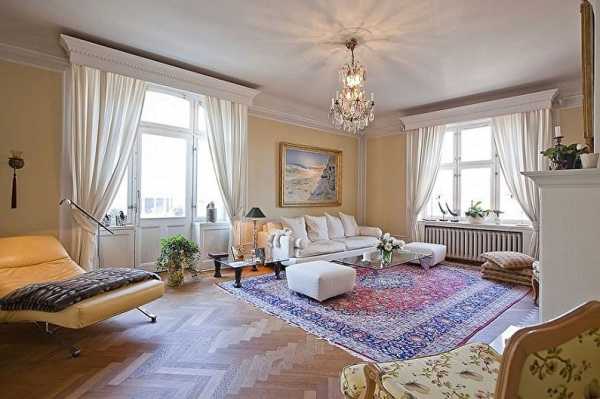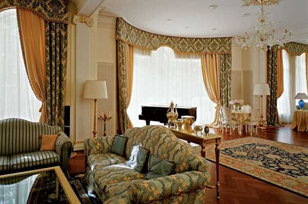 В оформлении солидного презентабельного интерьера гостиной могут использоваться сложные композиции из занавесей разных видов. Для такого декорирования может потребоваться трехрядный карниз. Эта конструкция позволяет повесить тюль, плотные и легкие занавеси, ламбрекены.