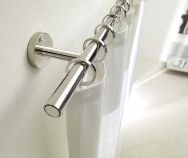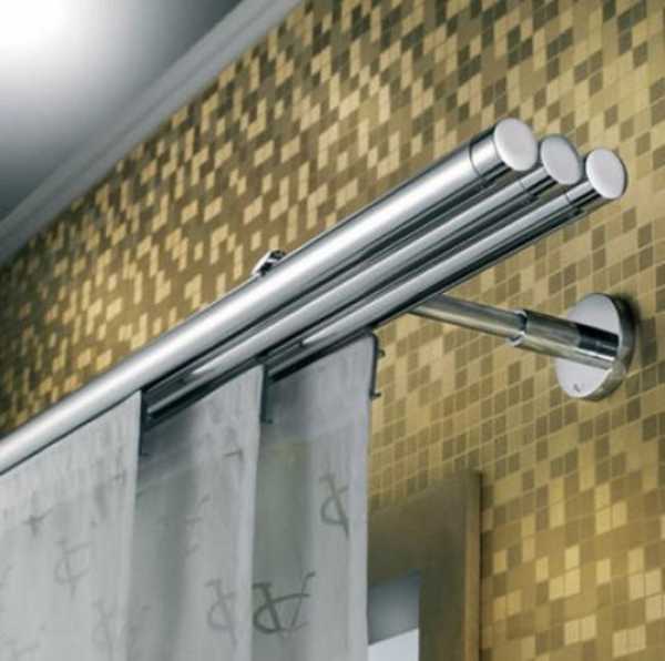 Данный аксессуар состоит из комбинированных мягких сплавов или из алюминия. Внешний вид напоминает трубку со специальными ячейками для прочного фиксирования крючков. Разборная каркасная система говорит о том, что снятие и вешанье карниза значительно упрощается.