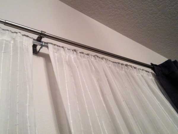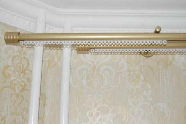 - Круглая форма является обычной штангой (на что вешается штора). Чаще всего, применяют трубу двойного яруса, где можно разместить одновременно и гардину, и тюль.
