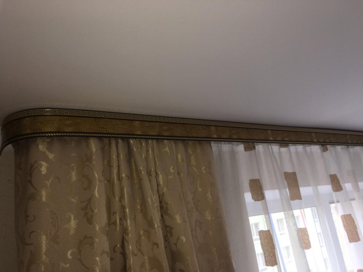 На фото пример, как можно красиво прикрыть карниз для штор при помощи потолочного багета (плинтуса). Этот вариант отлично подойдет, если у вас нет навесных потолков.