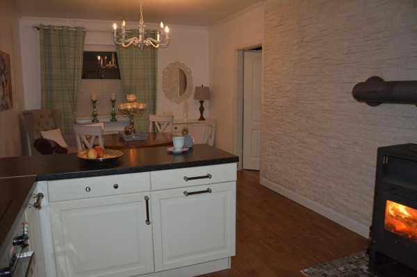 - Аспидно-зеленый — фактор комфорта в кухне с мебелью из сосны.