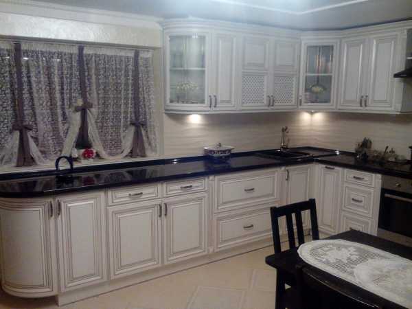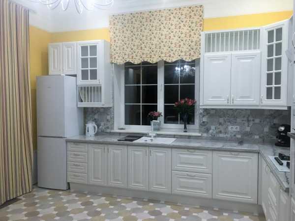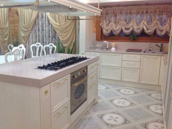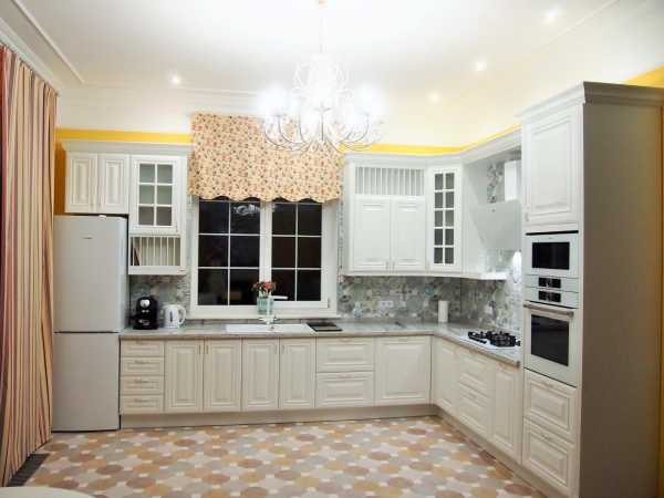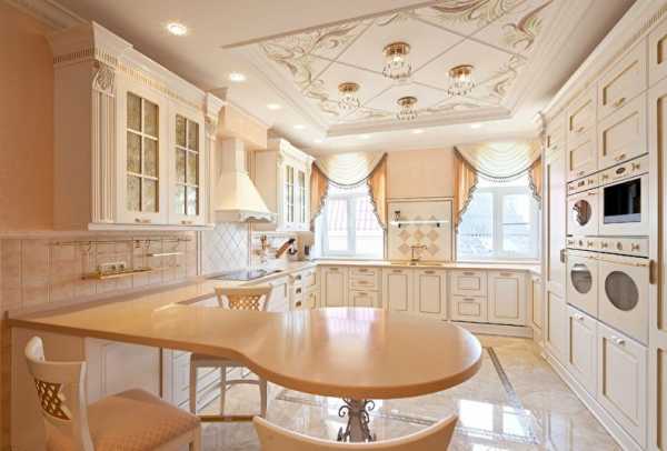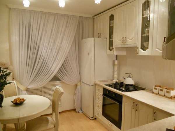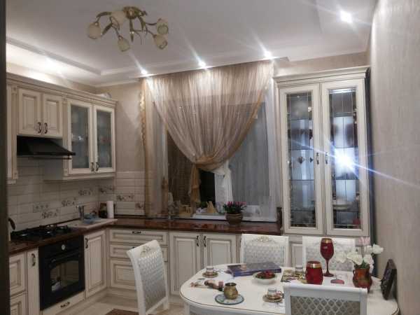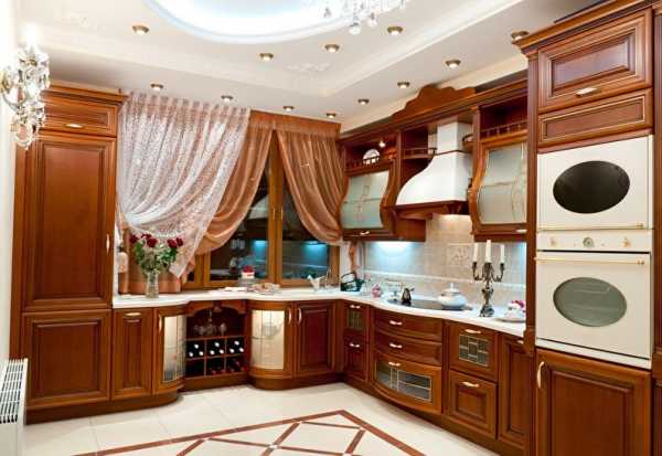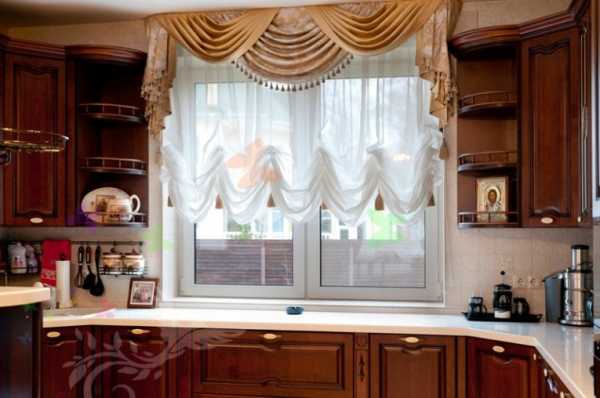 Для уже сложившего интерьера с декоративными излишествами можно подобрать тонкие простые занавески с элегантными драпировками из тюля или органзы. Чтобы сделать декор более выразительным, можно его дополнить ламбрекенами и подхватами. Ламбрекены, кстати, на классической кухне могут быть сколько угодно сложными — они не мешают функциональности кухни, а помещение приобретет роскошный, соответствующий выбранному стилю вид.
