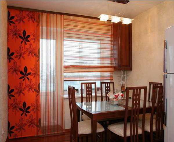 Двухцветные или комбинированные шторы выглядят оригинально и красиво на кухне.