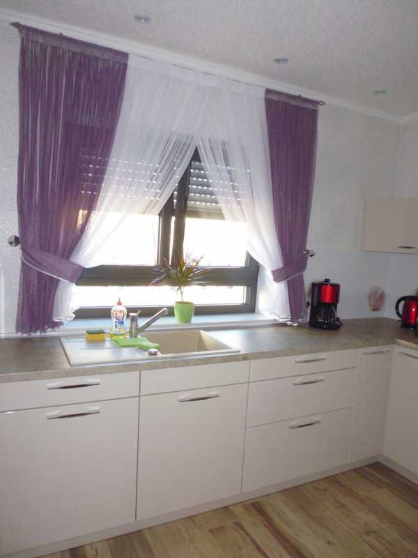 - 6 На кухне, расположенной на первом этаже частного дома, шторы выполняют не только защитную функцию, но и служат своеобразной «рамой» для пейзажа за окном. Наилучшими в этом плане специалисты считают ассиметричные и арочные занавески, занавески по типу ламбрекена и шторы с боковыми подхватами.