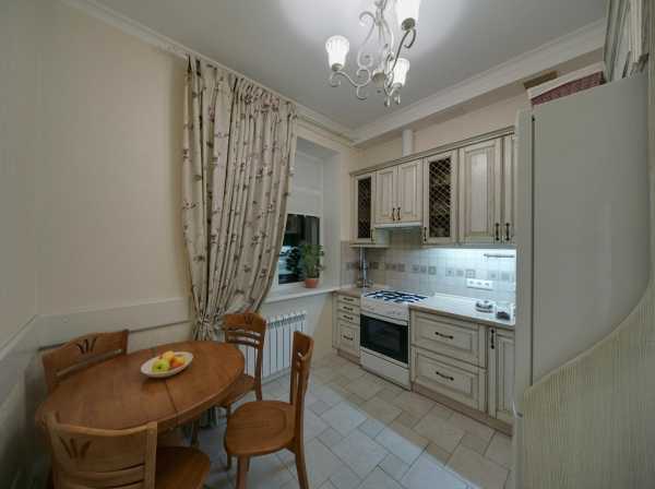 Классический стиль ассоциируется обычно со сложными многослойными конструкциями, однако допустимы такие излишества в спальне или в гостиной, но не на кухне. В небольшой кухне лучше использовать изящные короткие шторки, которые вполне отвечают требованиям современной классики, но смотрятся намного легче.