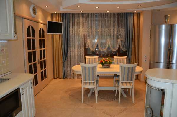 Такое решение идеально для просторной кухни-столовой, с большими высокими окнами. При этом нужно иметь в виду, что в обильных складках быстро скапливается пыль и испарения, поэтому кухня с такими шторами обязательно должна быть оснащена вытяжкой.