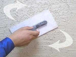 Технология затирки короеда так же проста и делается при помощи той же пластмассовой терки. Для этого необходимо определиться с рисунком, если вы хотите видеть «дождик», то следует затирать вертикально – вверх-вниз. Если же вам нравиться рисунок «барашек», тогда проделывайте круговые движения. После того, как вы затрете первый ряд, следует сразу же приступать к нанесению второго ряда, при этом необходимо стыки между рядами побрызгать водой, чтобы не были видны переходы. На видео ниже наглядно это продемонстрировано.