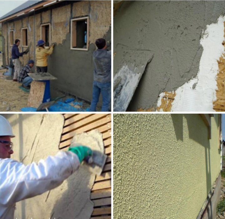 Наружная отделка каменных или каркасных стен, обычно состоящая из цемента, песка и гашеной извести, смешанных с водой и уложенных мокрым способом.