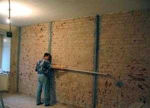 Если требуется выровнять старые стены, то изначально нужно простучать ее, возможно нужно отбить плохо держащиеся куски старого раствора или вовсе ее сбить всю. О том, как сбивать, поговорим чуть ниже. Затем максимально обеспыливаем поверхность и грунтуем глубокого проникновения грунтом. ждем полного высыхания грунтовки.