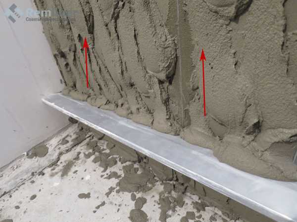 Маяки фиксируют на стене саморезами или монтажным клеем, если поверхность имеет большие неровности, то рейку выставляют по отвесу, набрасывают на стену по одной вертикальной линии несколько кучек густого раствора и фиксируют на них маяк. Шаг между направляющими должен быть чуть меньше длины имеющегося правила. Когда смесь схватится, рейки промазывают по краям и приступают к нанесению первого слоя штукатурки.