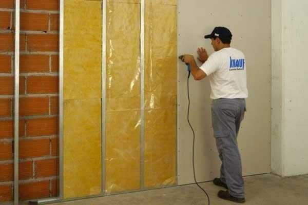 Между профилями очень плотно укладываются матрасы стекловолокна, минеральной ваты или любого другого материала. Они крепятся к стене специальными анкерами с широкими шляпками. Стыки запениваются или замазываются шпаклевкой. Необходимо обратить внимание на плотность крепления направляющих профилей. Если она будет недостаточной, вибрация еще больше усилит шум в комнате. После всего этого с помощью саморезов на готовый каркас из профилей крепятся гипсокартонные листы. Затем проводятся все необходимые работы по финишной отделке стен.
