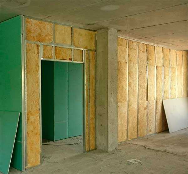 - гипсокартонные листы в сочетании с пористыми материалами: эковата, минеральная вата, целлюлозный утеплитель. Плюсами таких материалов являются: хорошая защита от шума и создание дополнительной теплоизоляции внешних стен. К минусам можно отнести: сложность монтажа и большое количество пыли при нем, потеря значительной площади помещения, так как утеплитель имеет толщину до 12 см;