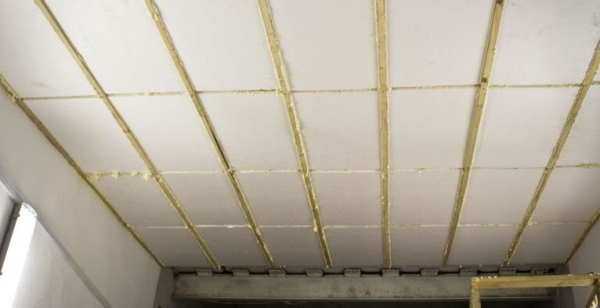 Для шумоизоляции перекрытий применяют маты из минеральной ваты. Для того чтобы минимизировать потерю высоты потолка, применяют ватные плиты, толщиной 50 мм. Шумоизоляционные покрытия укладывают в проёмы заранее установленной обрешётки из бруса или металлического профиля для гипсокартона.