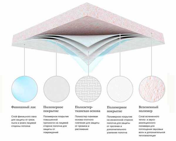 Отверстия в полотне натяжного потолка делают диаметром не более 0,1 мм. Их расположение между собой около 2 мм обеспечивает наличие около 250 000 дырочек на 1 м2 поверхности. Натяжное покрытие имеет толщину 0,17 мм. Высокие шумоизоляционные свойства полотна не нуждаются в установке дополнительных акустических панелей.